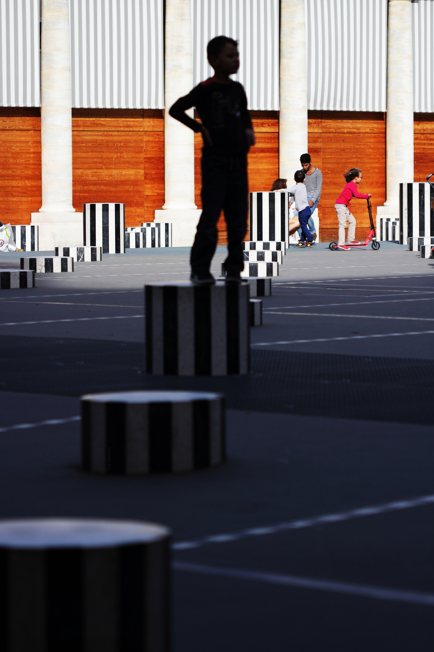 Belles photos et une très belle silhouette d’enfant, pas facile à photographier, les colonnes de Buren, si on veut échapper aux images convenues !