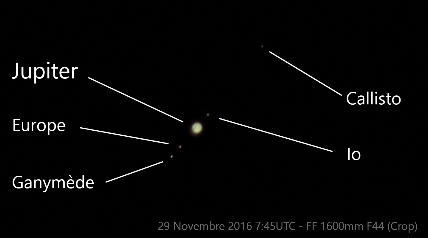 Profitant de conditions exceptionnellement favorables pour Paris, j’ai enfin pu faire un cliché de la géante, entouré de ses lunes.