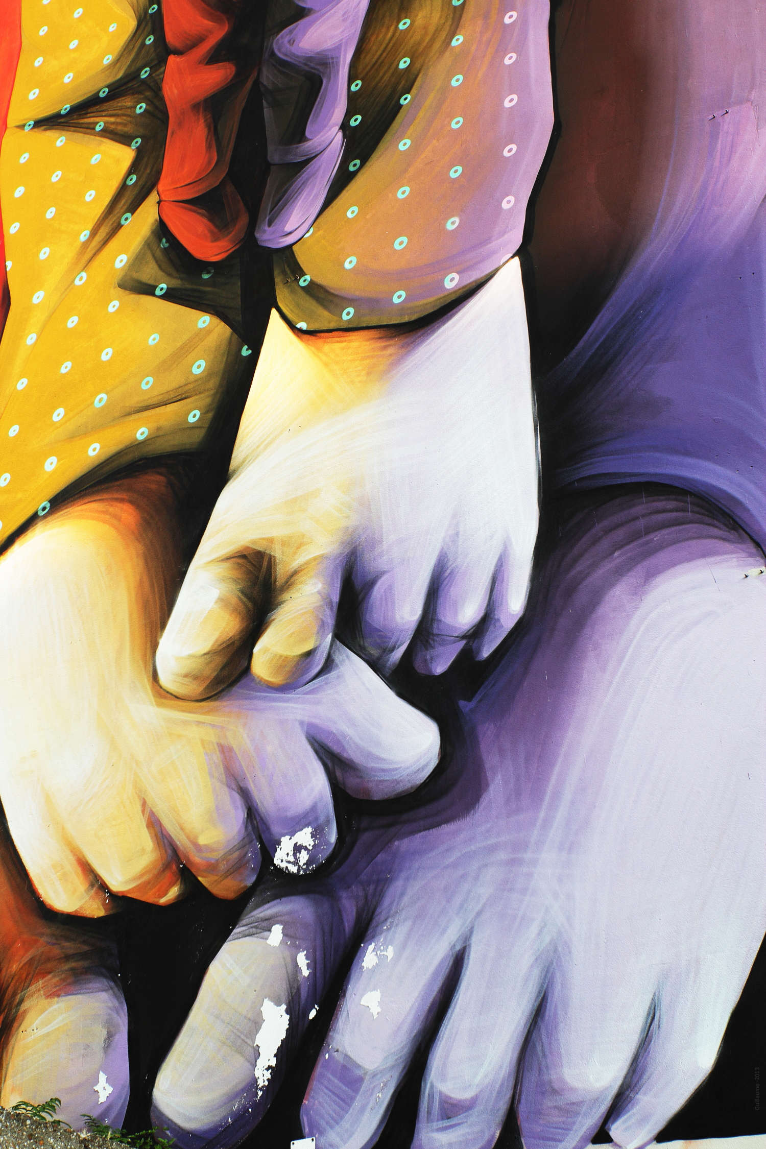 Italy avenue, the building facing the work of INTI « Utopia is their future » and a close-up at the bottom of the mural, which is already beginning to flake.