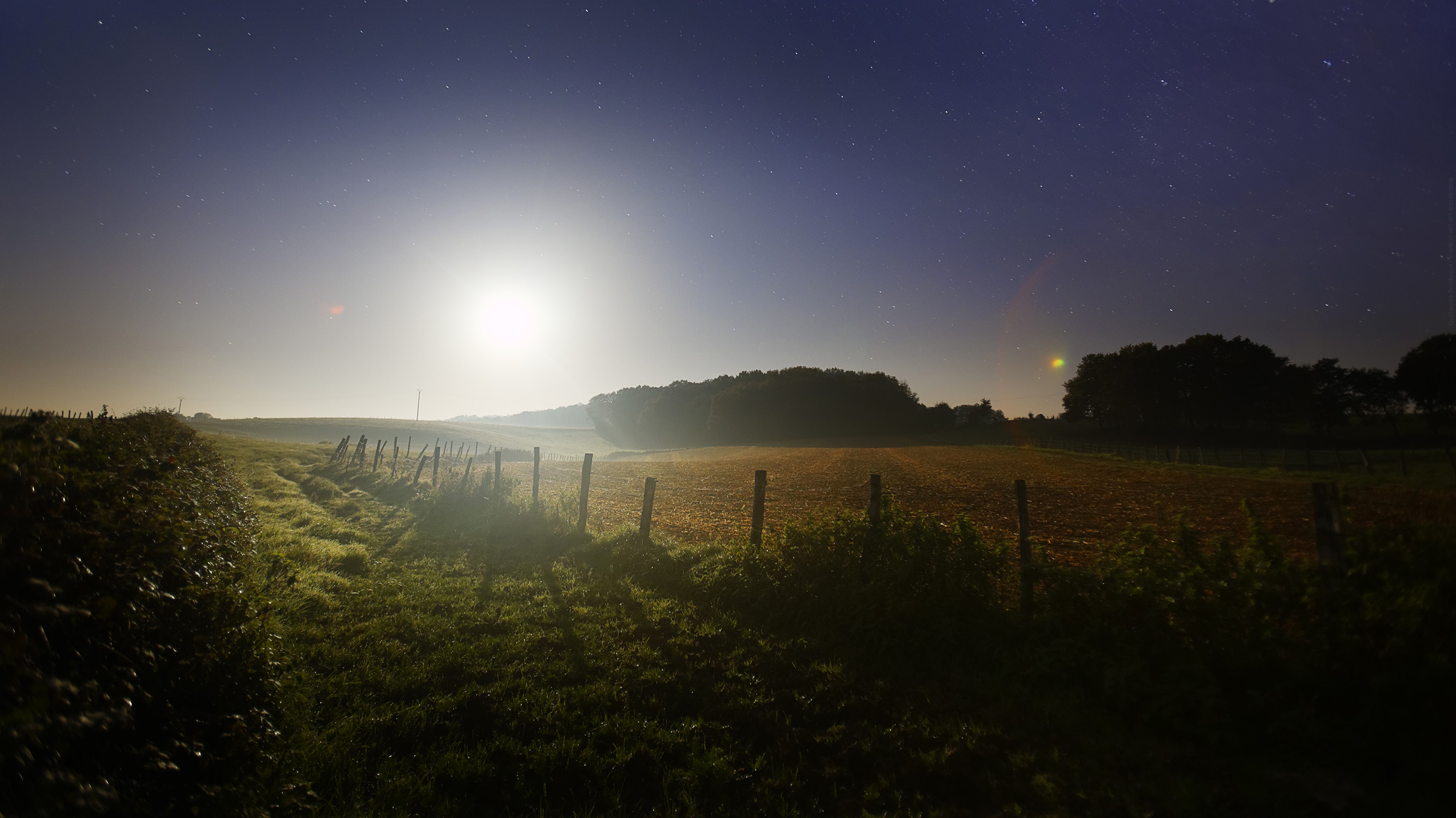 Tour d’horizon d’un coucher de lune dans le Jura, de face puis de dos. On voit à quel point elle est lumineuse quand l’atmosphère est claire (une légère brume diffuse la lumière au niveau du sol et de l’horizon ce qui explique le halo lumineux), la 2ème photo est en une seule exposition et la lune suffit à éclairer le premier plan.