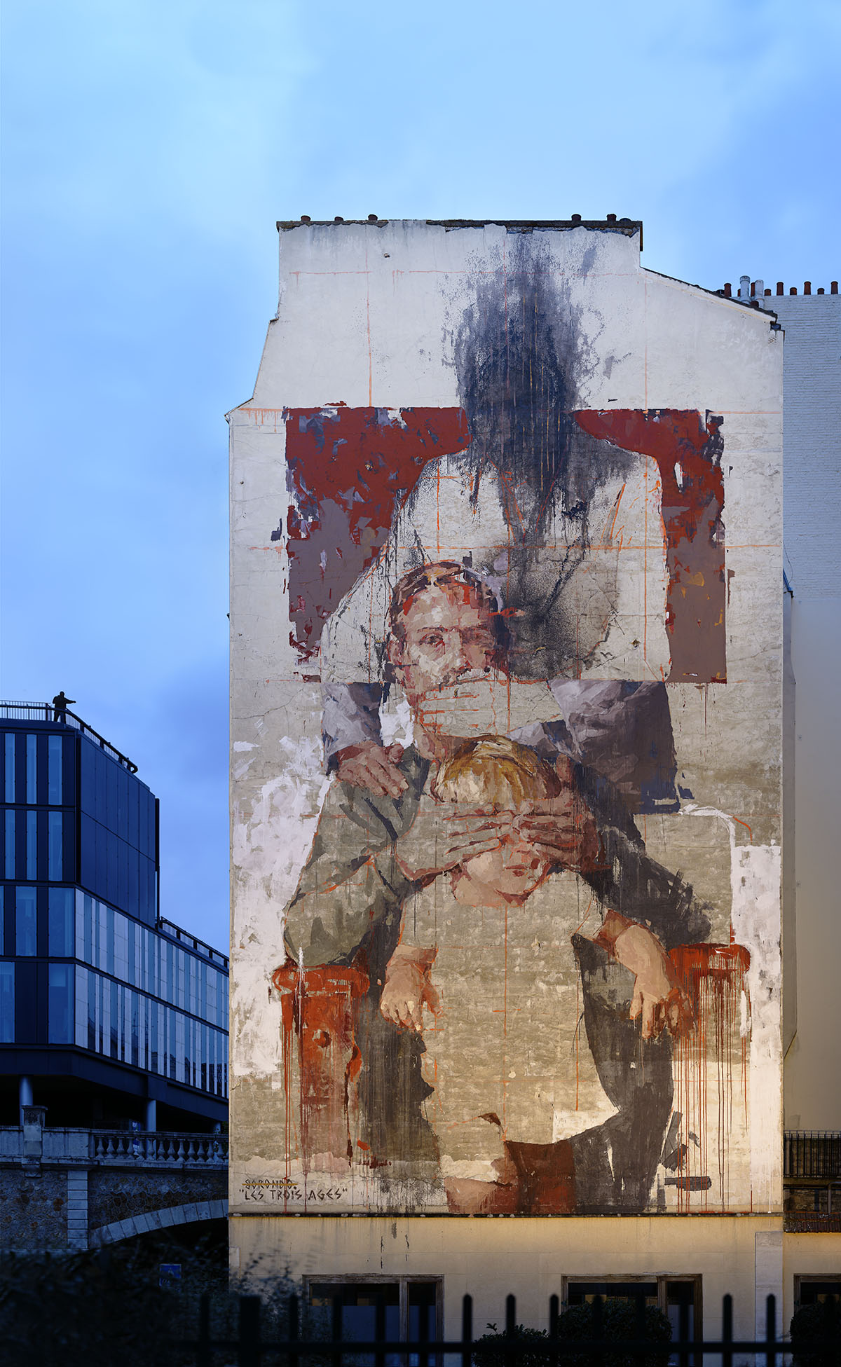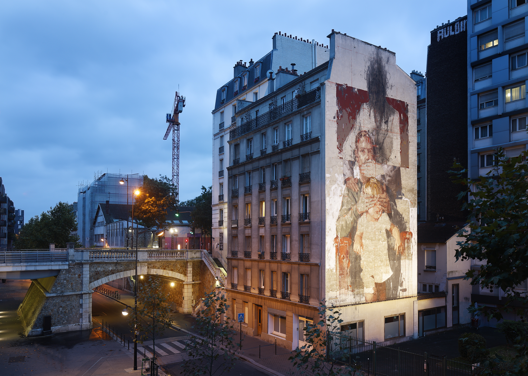 Dernière photo du parcours street-art de la nuit blanche, mon coup de coeur : Borondo, avec sa fresque « Les trois ages », à gauche au loin un mannequin de Mark Jenkins montre du doigt cette œuvre monumentale.